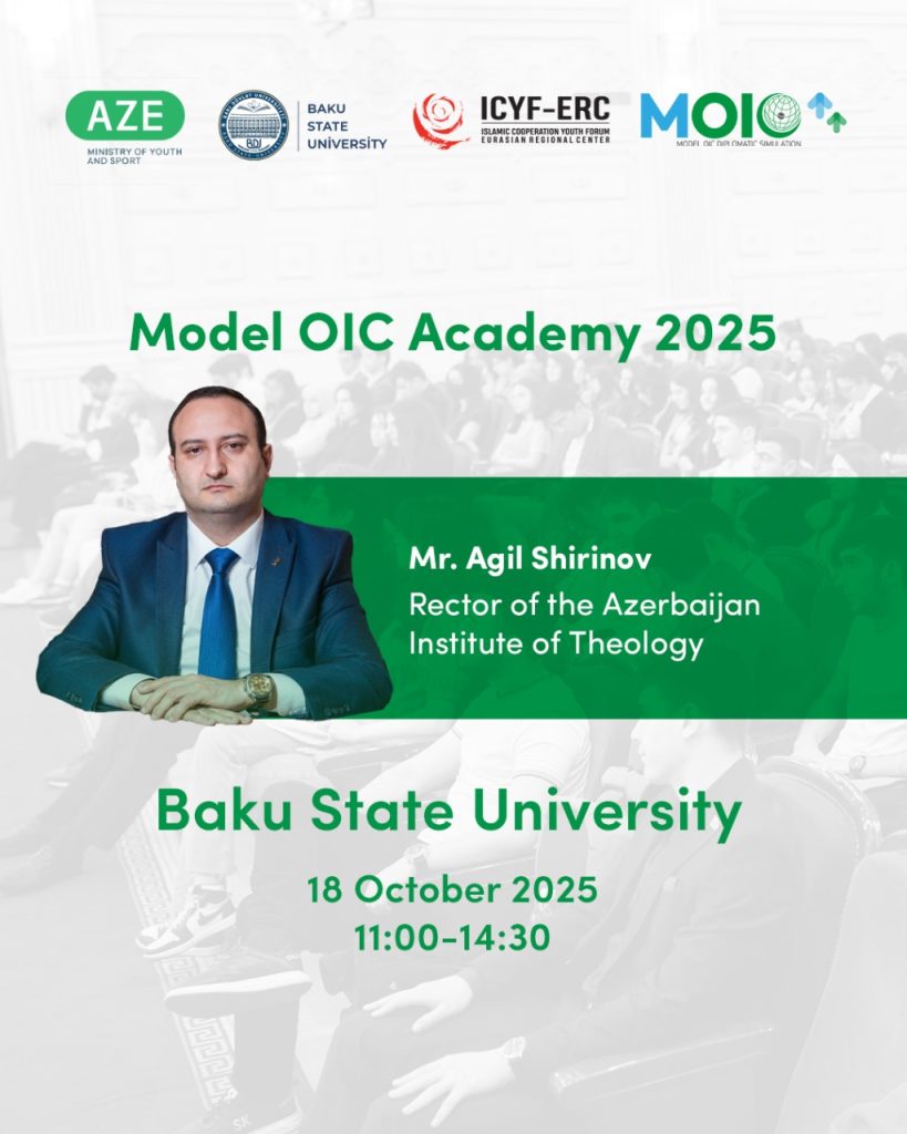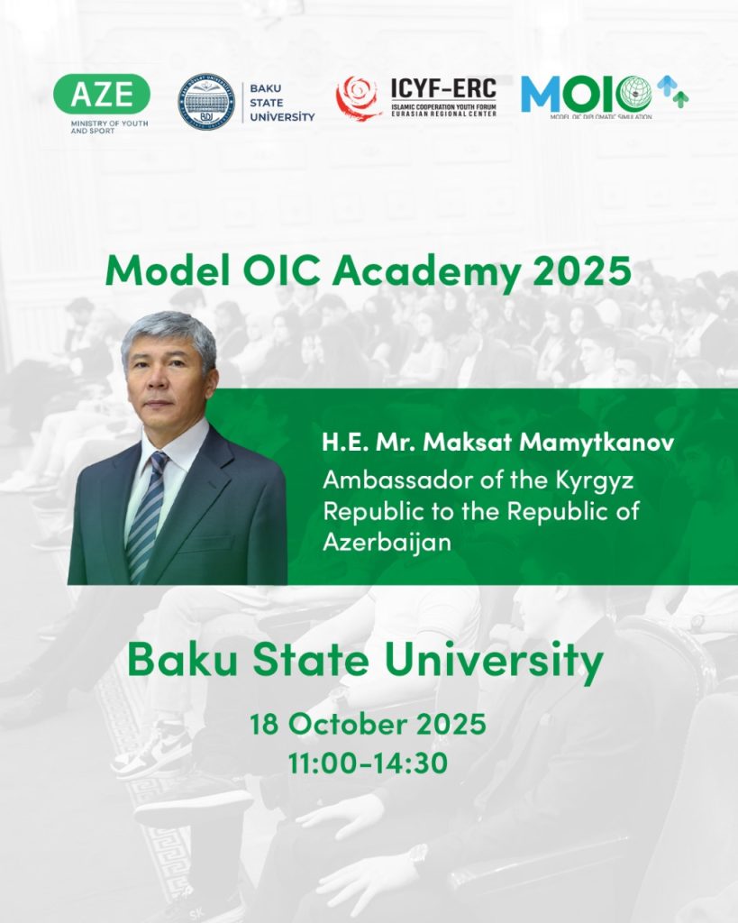 We are pleased to share with you the third session of the Model OIC – International Relations Academy 2025, organized by the Eurasian Regional Center of ICYF (ICYF-ERC) in partnership with the Ministry of Youth and Sports of the Republic of Azerbaijan and Baku State University, to be held on October 18 at Baku State University (III building).
