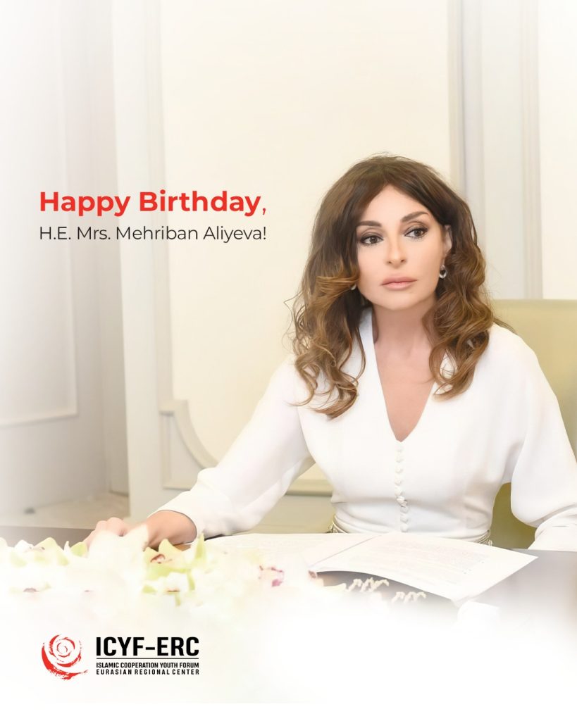 The international Board and whole staff of the Eurasian Regional Center of Islamic Cooperation Youth Forum (ICYF-ERC) extend their cordial congratulations and warmest wishes to H.E. Mrs. Mehriban Aliyeva, the First Vice-President of Azerbaijan and Goodwill Ambassador of #ICESCO on the occasion of Her Excellency’s birthday.